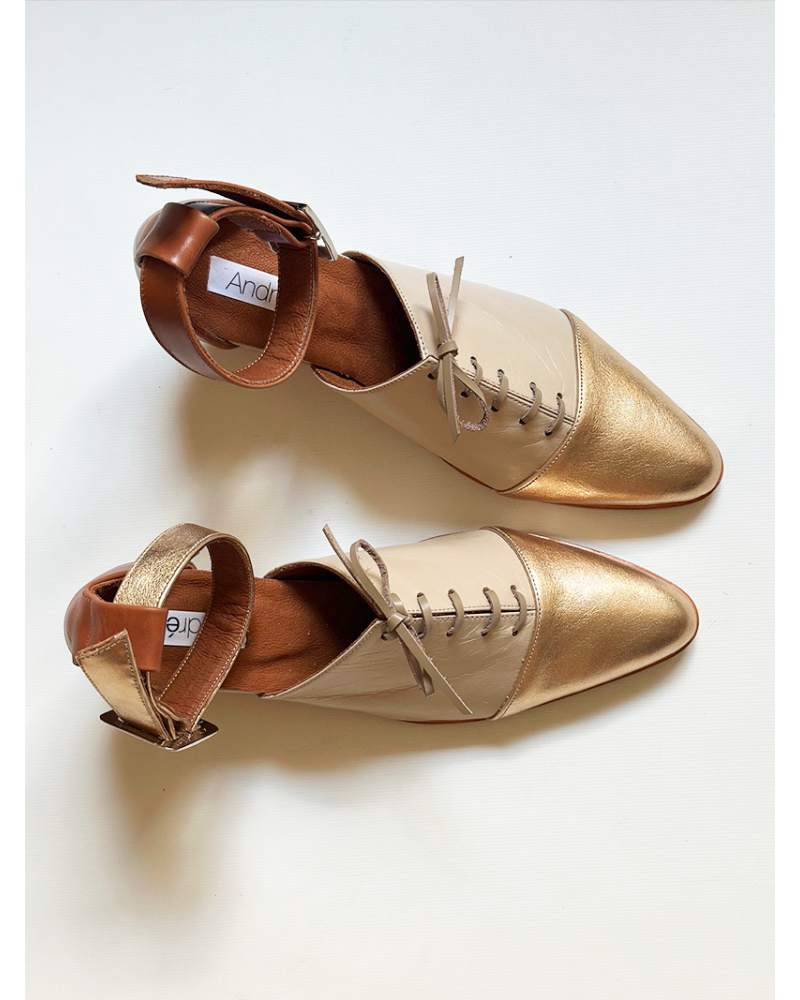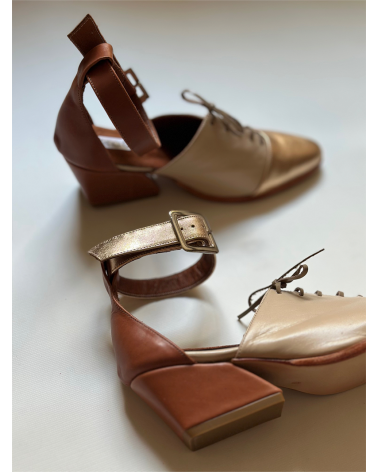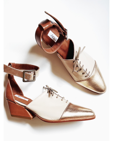 El modelo Celeste en versión Off White & Gold, realizado en 100% cuero, combina sutileza y carácter en una paleta luminosa, realzada por toques en color caramelo que aportan calidez y sofisticación.